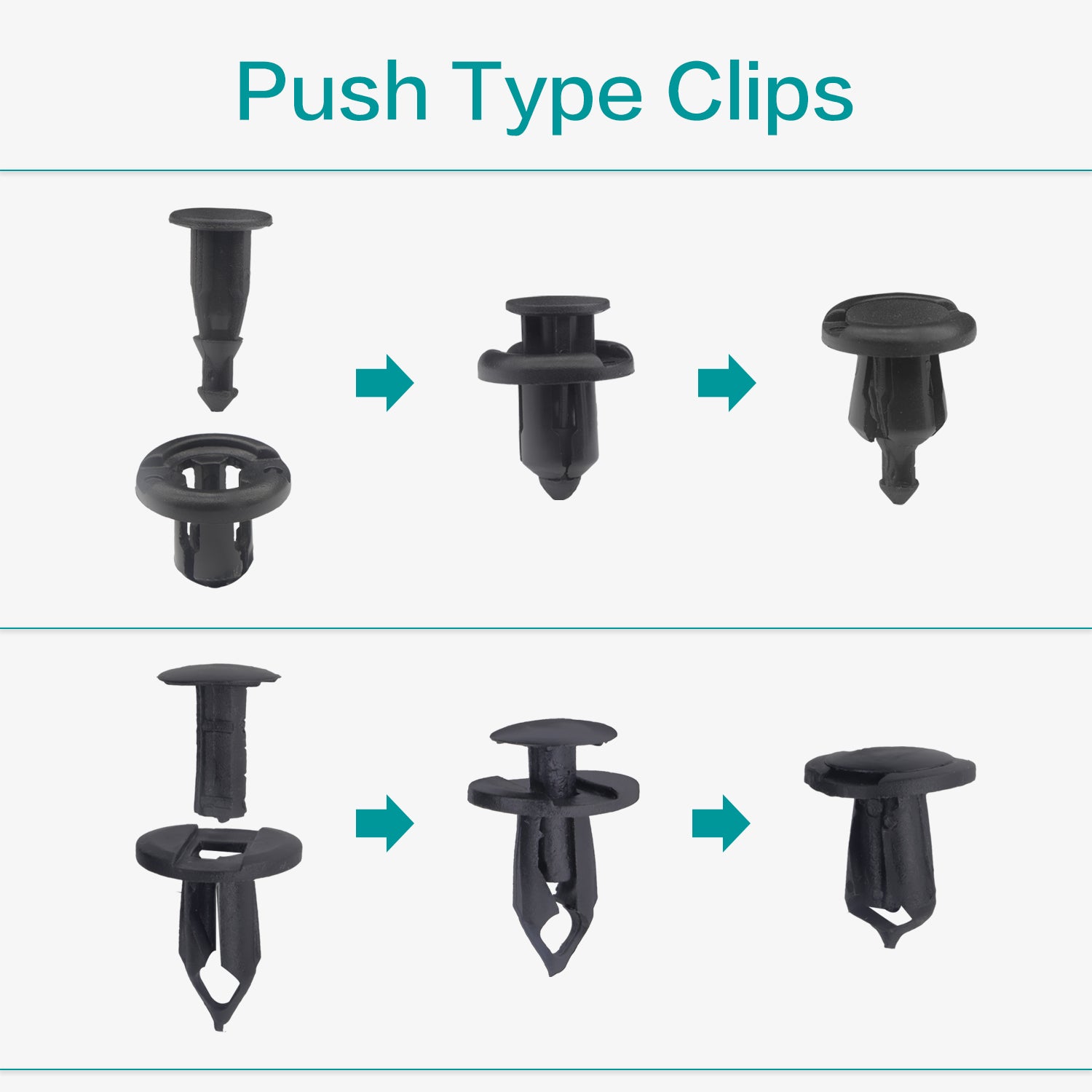 - Widely application - these Push clips are widely used for trim panel clips, door trim clips, door panel clips, bumper clips, Fender clips, engine cover, and splash shield retainers replacement. It always covers some applications include telecom equipment, motor vehicles, domestic appliances, furniture, and electrical equipment.