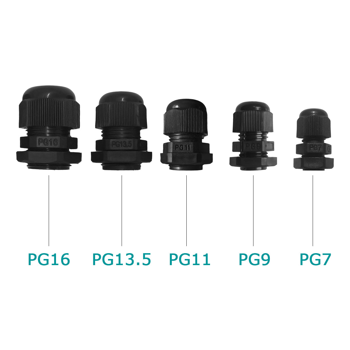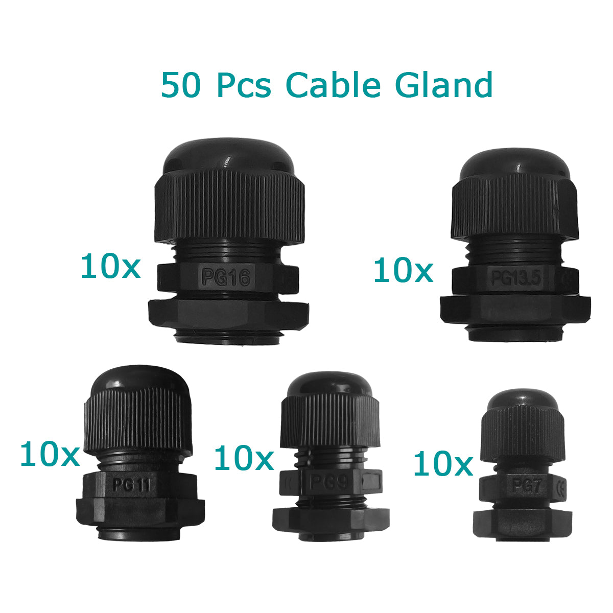 - Package include: Package include: 10 x PG7, 10 x PG9, 10 x PG11, 10 x PG13.5, 10 x PG16 cable gland connectors